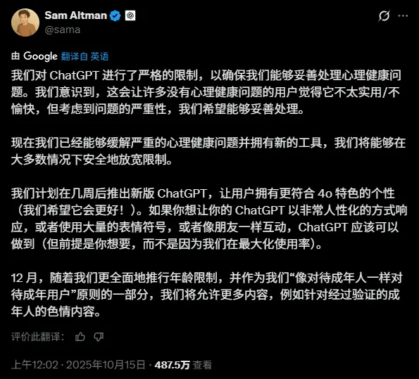 更劲爆的是,12 月将推出更全面的年龄限制,允许 GPT 在验证成年身份的情况下提供涩涩内容!好家伙,第一生产力来了。