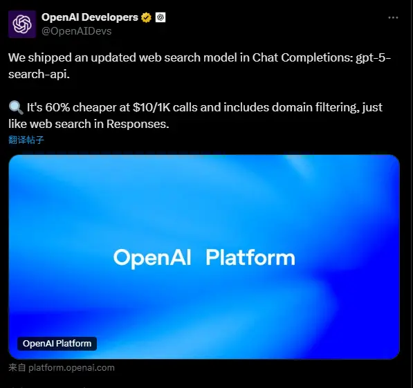 OpenAI 发布 GPT-5 搜索 API:价格直降 60%,支持域名过滤